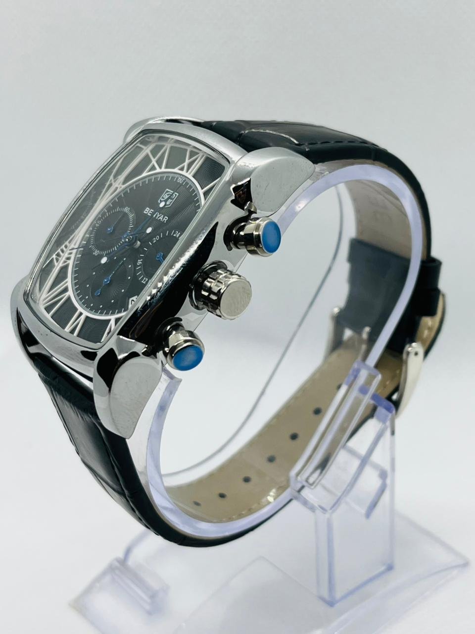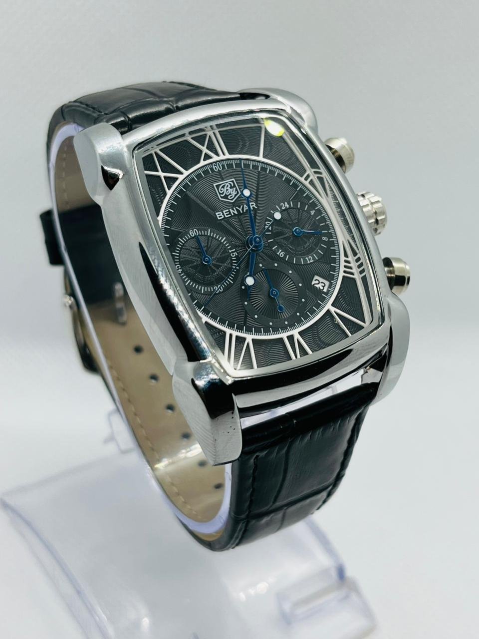 Benyar BY-5113 is a stylish square-shaped chronograph watch featuring a black dial silver case and black leather strap.